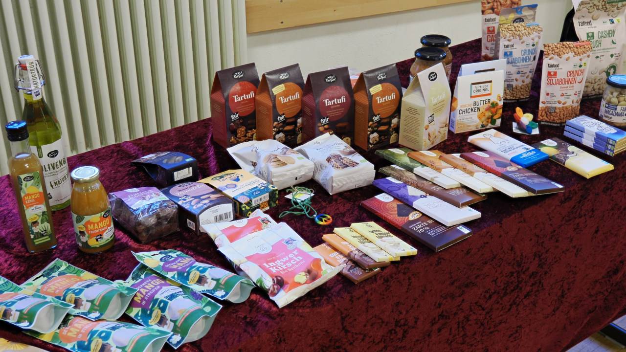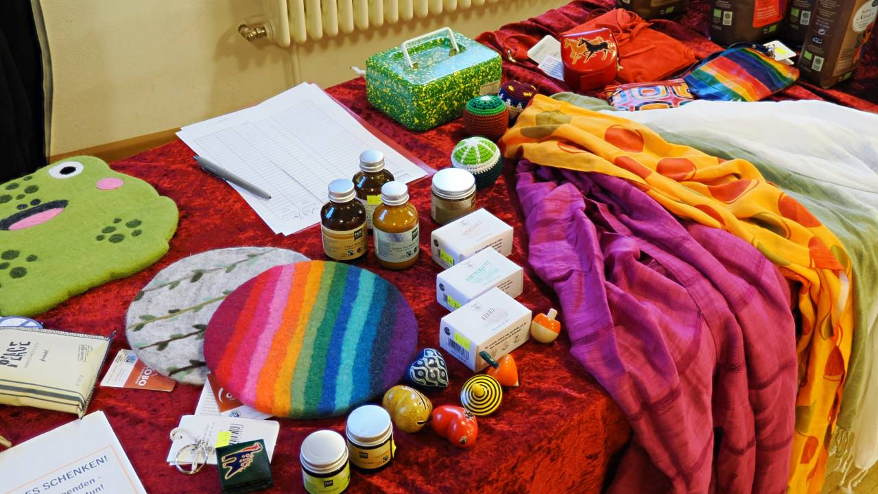 Helga Heuschmid-Keiper hatte die Initiative für die Evangelische Kirchengemeinde übernommen, wir waren dran. Das Vorbereitungsteam hatte einiges zu organisieren, der Gemeindesaal unter der Friedenskirche war schön geschmückt und gut vorbereitet. Der Weltladen trug zur Farbenpracht mit seinem Stand bei, Sabine Stock und Regine Aisenbrey hatten ihn beigesteuert.