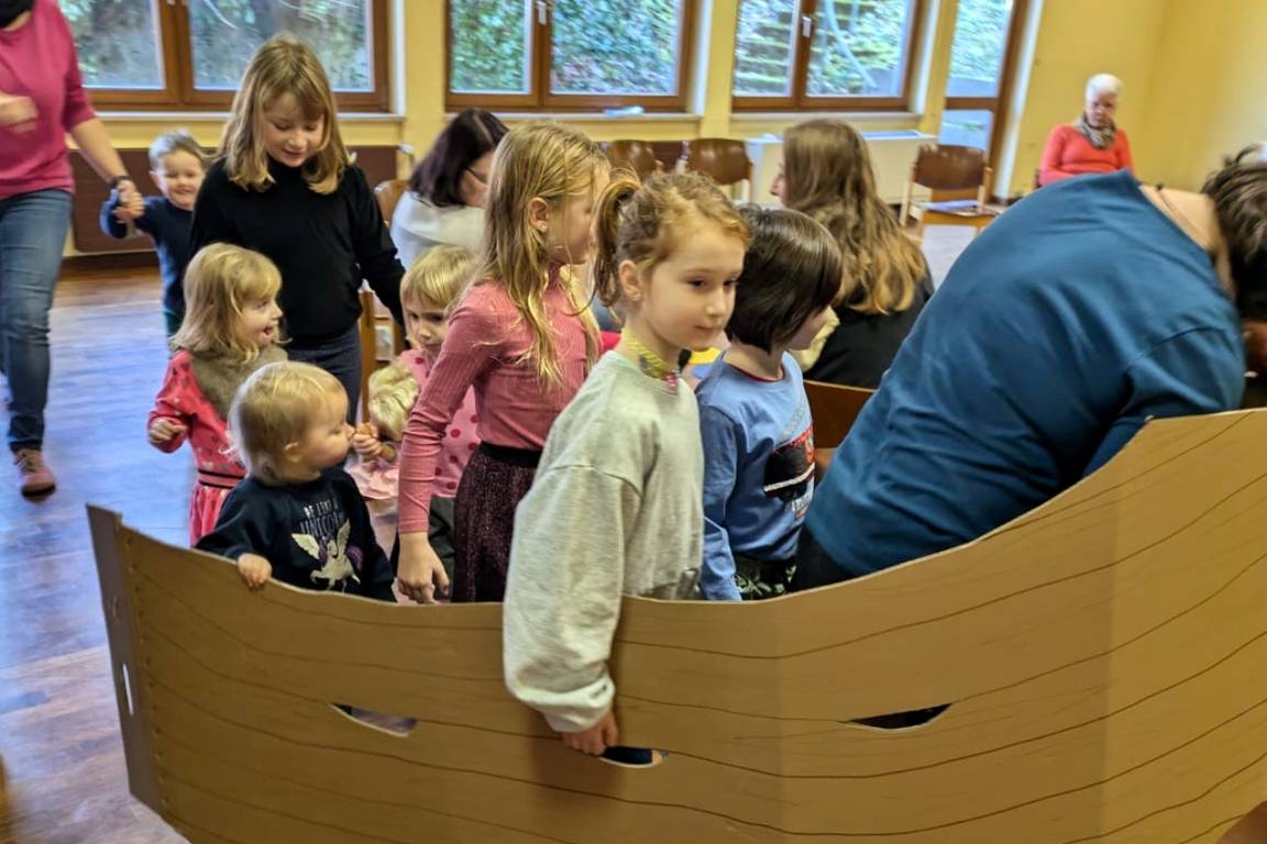 Der ökumenische Kindergottesdienst in Öflingen ist ein langjähriges Erfolgsmodell, das nach wie vor viele Familien sonntags anzieht. Das Team aus Ehrenamtlichen der evangelischen und katholischen Kirchengemeinde lässt sich immer etwas Kreatives einfallen: Es wird gemeinsam gesungen, gefeiert, gebastelt zu einer biblischen Geschichte. Beim letzten ökumenischen Kindergottesdienst stand die Geschichte, wie Jesus mit seinen Jüngern in einem Boot auf einem See in einen Sturm geriet, im Mittelpunkt. Dieses Erlebnis durften die Kinder als Jünger-innen nachspielen und nachempfinden, was Vertrauen bedeutet und dass Jesus immer bei uns ist.